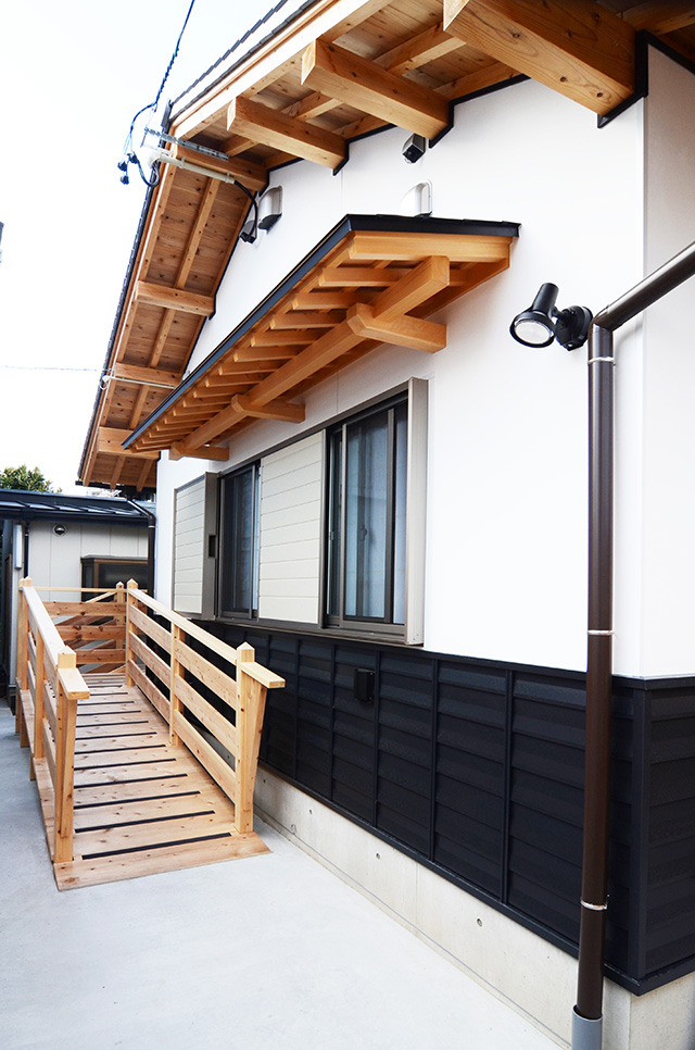 無垢の杉板を貼った玄関ポーチと車椅子対応のスロープ。