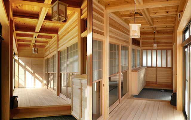 壁は無垢の杉板、床は無垢の桧の縁甲板。桧の電話台は職人の手作りです。