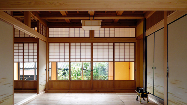 無垢吉野杉の雪見障子。障子の向こうは日の降り注ぐ縁側で居心地の良い空間です。