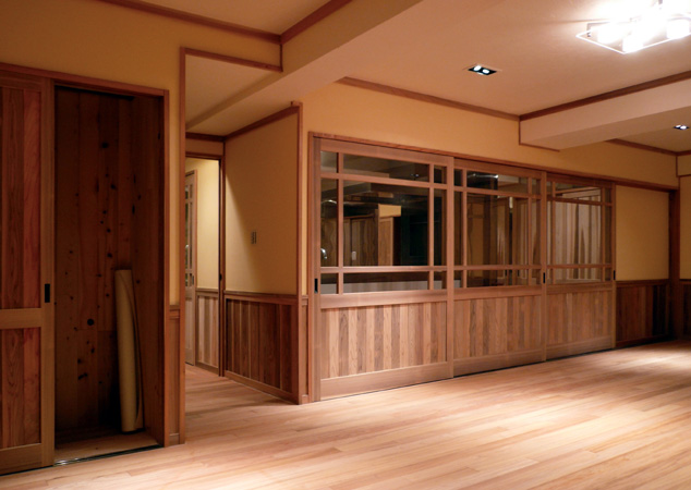 3LDKのマンションを1LDKへ。全室漆喰壁と杉板壁で仕上げ、床板を全面花櫚フローリングで仕上げています。
